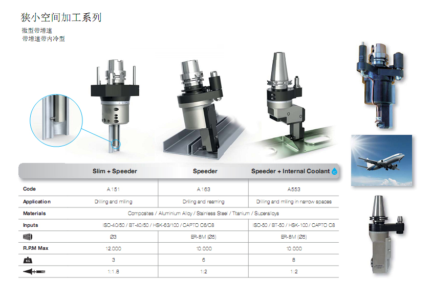 航空器由于其運(yùn)行的特殊性,必需絕對(duì)高可靠性、高使用壽命、高強(qiáng)度,一般零部件通常是由高溫合金、鈦合金、鋁合金及可加工性普遍較差的碳纖維復(fù)合材料(CFRP)及蜂窩材料(HONEYCOMB)材料高速切削加工而成。 而航空發(fā)動(dòng)機(jī)零件通常采用耐熱超級(jí)合金(HRSA)(如Inconel合金、鎳基合金、Waspaloy合金等)制造,鈦合金和復(fù)材蜂窩材料則通常被用于制造如機(jī)身、機(jī)翼等許多飛機(jī)零件。由于零件用途所需要的材料結(jié)構(gòu)特性各異,這些合金的可加工性普遍較差且工件外形復(fù)雜多樣,涉及到小腔小口徑、邊側(cè)加工的地方非常普遍,同時(shí)由于航空材料的特殊性對(duì)刀具的剛性切削性能要求非常高。 西鈦珂專業(yè)航空加工角度頭產(chǎn)品系列: 1、狹小空間鉆孔銑削系列:可帶增速;最小可以實(shí)現(xiàn)16mm口徑腔內(nèi)加工; 2、狹小空間銑槽系列:最小可以實(shí)現(xiàn)13mm口徑腔內(nèi)加工;特殊情況下腔口徑不限; 3、帶振動(dòng)系統(tǒng)系列:對(duì)難加工材料實(shí)現(xiàn)類似超聲波振動(dòng)加工;提高加工效率; 4、帶真空吸塵系統(tǒng)系列:用于對(duì)復(fù)材等的加工; 5、锪窩系列:用于锪窩專業(yè)應(yīng)用; 6、 高轉(zhuǎn)速系列:標(biāo)準(zhǔn)系列最高可達(dá)20000rpm ;可帶增速; 7、其他定制角度頭,Specials are our core competence!