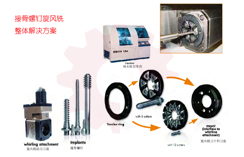 西鈦珂提供的Tornado?旋風銑是第2種方式,我們可以為客戶提供從走心機選型到旋風銑刀座、刀盤、刀片完整的加工解決方案! Tornado?旋風銑配套的主要走心機廠家: 瑞士TORNOS、日本CITIZEN、日本STAR、日本津上TSUGAMI、日本MURATEC、韓國韓華HANWHA 、韓國NEXTURN、德國德馬吉GILDEMEISTER、德國TRAUB 及歐洲MANURHIN; 其他廠家:可以提供定制; 西鈦珂可以提供“ 瑞士型走心機+旋風銑動力刀座+旋風銑刀盤刀具 ”完整的接骨螺釘加工解決方案! 注:1、我們的旋風銑刀座只適用于瑞士型走心機床,如西鐵城、TORNOS 、STAR 、 津上(TSUGAMI)等; 2、旋風銑最適用于加工零件為醫療接骨螺釘等高附加值小螺紋零件; 3、旋風銑主要由三部分組成:旋風銑動力刀座+刀環+刀片; 4、目前西鐵城、TORNOS 、STAR 、 津上(TSUGAMI)動力刀座可選150BAR超高壓內冷; 西鈦珂ToolSwiss?瑞士制造并原裝進口的高性能旋風銑刀片6、9、12片裝可以和施瓦諾克、HORN、utilis、山特維克等互換使用,并具有很好的性價比!