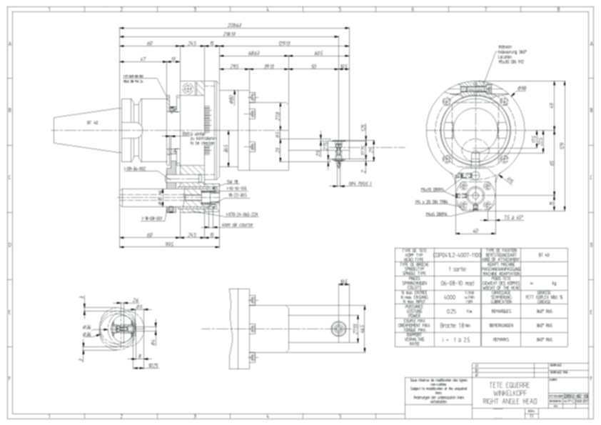 客戶:某軍工企業 應用:用于客戶指定應用(36mm腔內銑槽 槽寬10mm 槽深8mm); 具體零件名稱保密; 機床:德馬吉加工中心;BT40主軸; 角度頭參數:最高轉速:RPM10000;增速比:1:2.5;重量:約4.5KG;輸入:BT40 ;輸出刀具直徑:4mm 齒輪采用經過精密測量中心精密測量配對的高精度磨削錐齒輪保證大扭矩、低噪音運行; 軸承:P4級以上精密高速軸承,發熱小; 殼體:采用高強度和品質合金制造;; 潤滑: Kluber NBU15長壽命免維護油脂潤滑; 工件圖紙(3D示意圖): 角度頭圖紙(經模糊處理): |