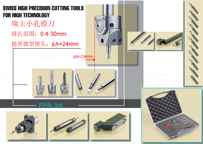 ? 內(nèi)圓車削,可小至? 4.8 mm; 3、微型小孔鏜刀:加工范圍:0.4mm-30mm;微型精鏜頭:¢ 24mm ,見下圖; 4、MiniTools 系列(ISO刀片): ? 內(nèi)圓車削,可小至? 5.8 mm 和? 8.0;